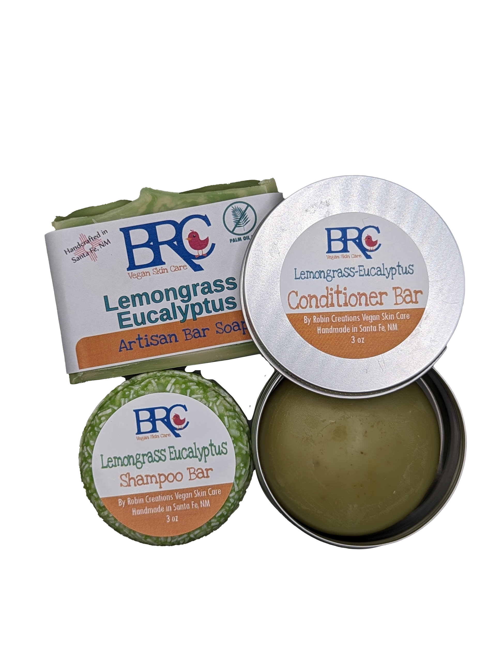 This Vegan Shower Set is the perfect way to get gorgeous-looking hair and skin! It's incredibly refreshing, luxurious, and moisturizing! Comes with 1 Sulfate-Free Shampoo Bar, 1 Conditioner Bar, and 1 Artisan Soap Bar, all in an organza bag! The soap & shampoo produce a rich, fluffy lather and rinse very cleanly. The conditioner bar is made with nourishing plant oils and moisturizers that will leave your hair soft and silky like vegan butter! Scented with 100% pure essential oils or Skin-Safe Fragrance Oils (Skin-Safe Fragrance Oils are denoted by an *). Prepare to be transported away!