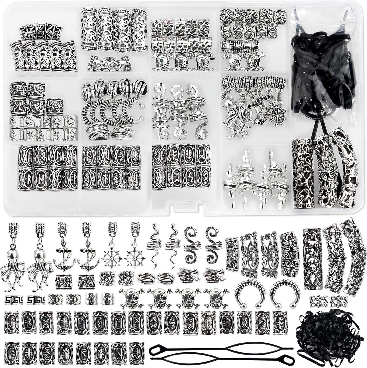 WNJ Viking Hair Jewelry, 165 PCS Beard Beads, Nordic Rune Tube Beads, Hair Tube Braided Dreadlocks Viking Jewelry, DIY Braid Hair Charms Hair Braid Bracelet Pendant Necklace, Metal Clips Cuffs Rings